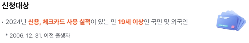 - 조건: 2024년 중 본인 명의의 국내 신용/체크카드 실적이 있는 자