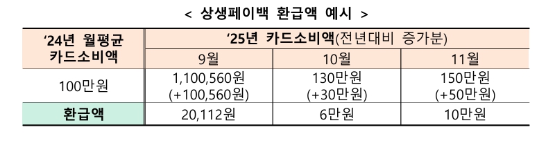 만약 2024년 9월에 카드로 100만 원을 썼다면, 2025년 9월에 130만 원을 썼을 때 증가분은 30만 원입니다. 이 중 20%인 6만 원이 디지털 온누리상품권으로 환급되는 구조죠.