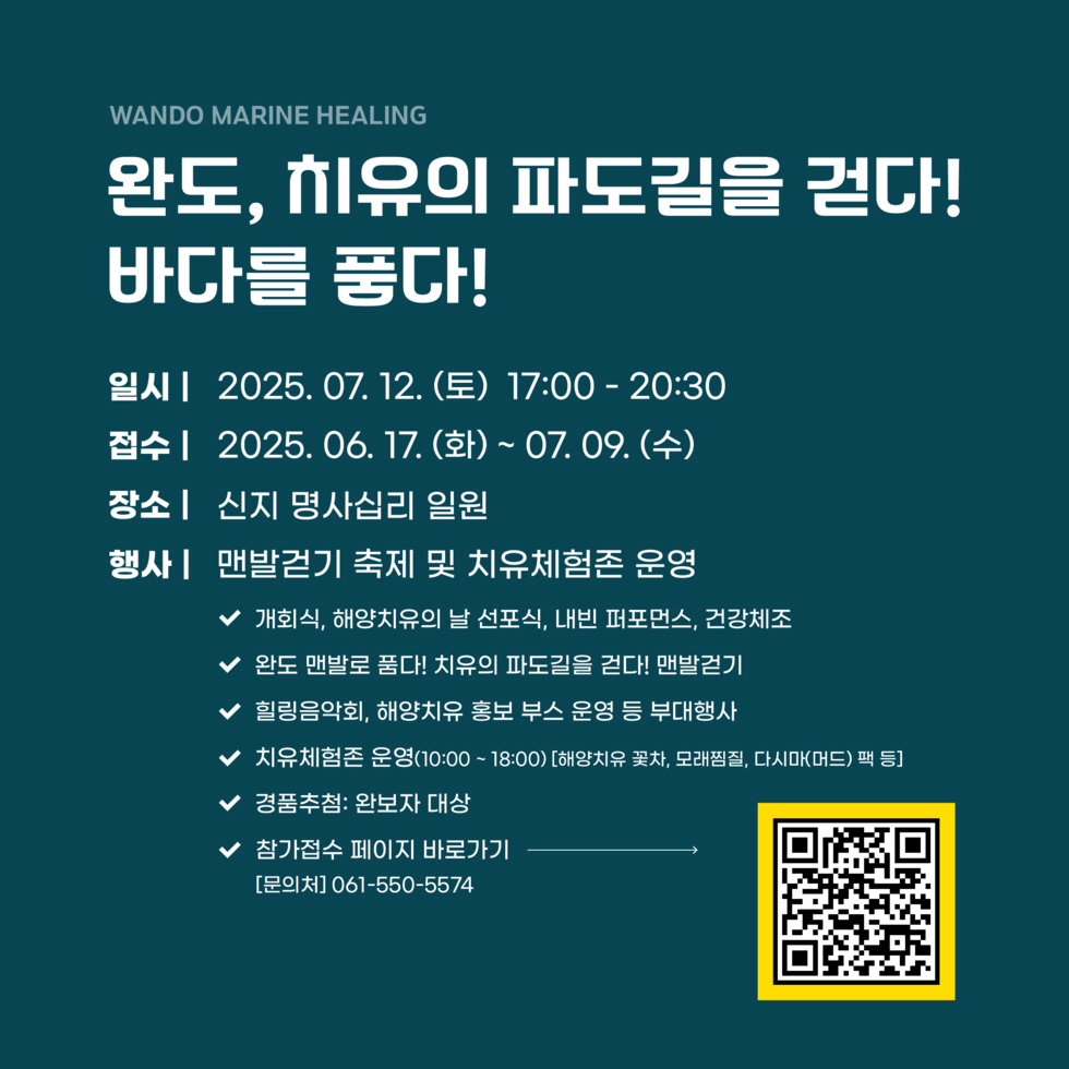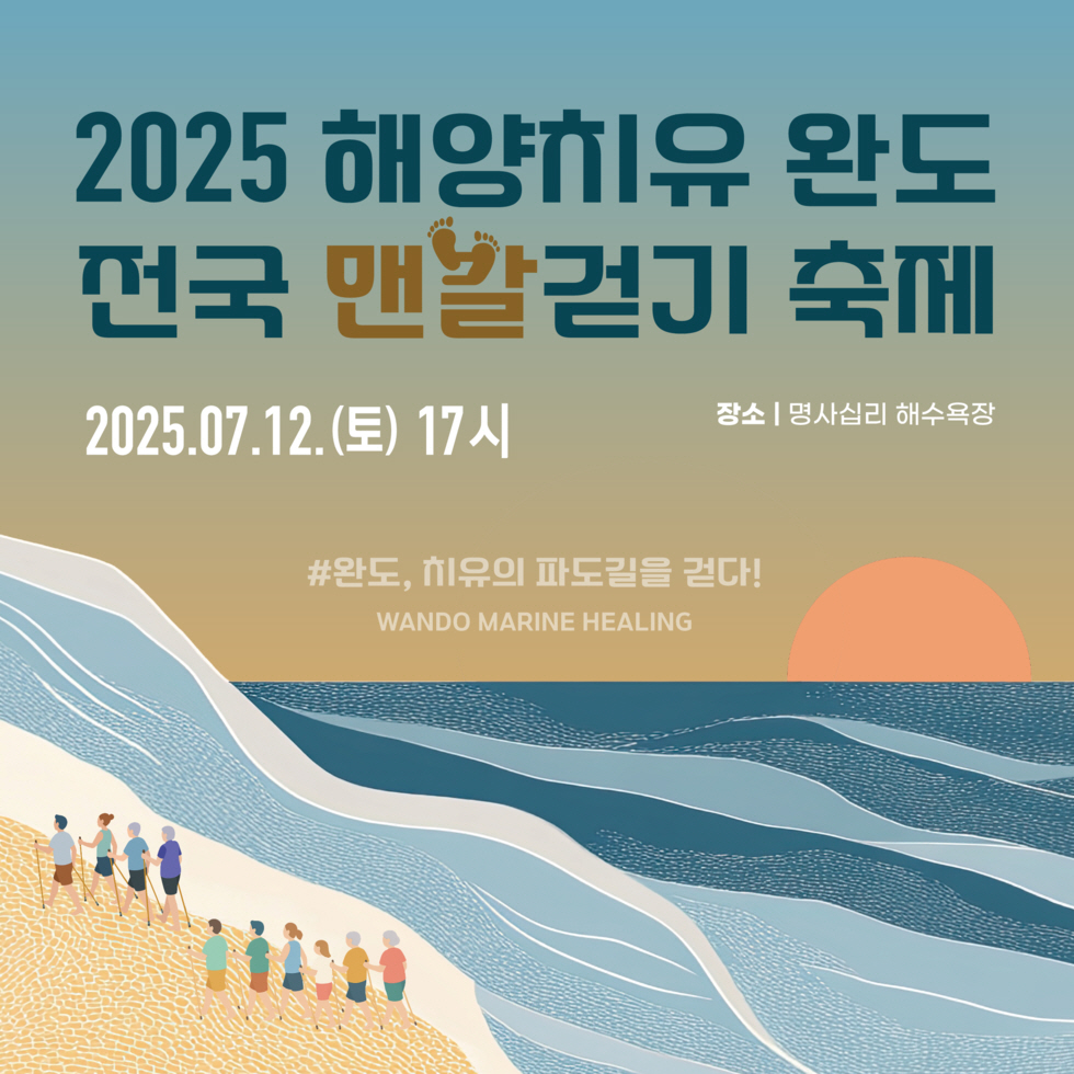 개장일인 7월 12일에는 ‘완도, 치유의 파도길을 걷다!’라는 주제로 전국 맨발 걷기 축제가 열립니다. 모래 위를 맨발로 걸으며 해양 치유의 시작을 알리며, 가족·연인 참여에 최적입니다.