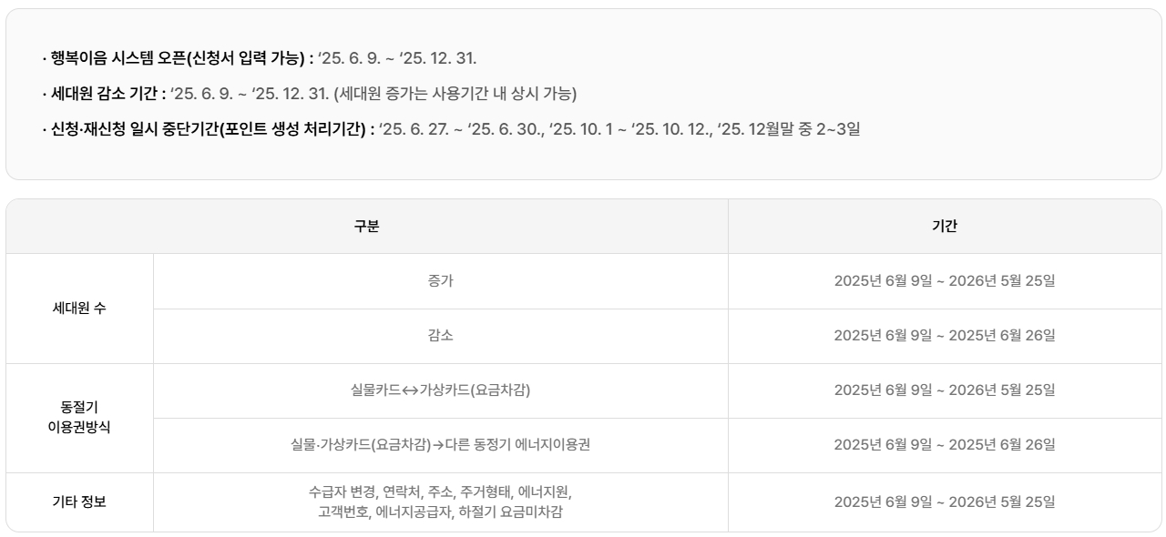 ※ 2025년부터는 지원금액이 동, 하절기 구분 없이 사용기간 내 자유롭게 사용 가능하므로, 하절기에 바우처를 사용하지 않고, 동절기에 몰아서 사용하기를 희망하는 경우에는 하절기 요금 미차감 신청이 필요합니다.