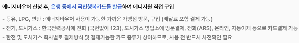 - 신청대상 : 전기, 도시가스, 등유, LPG, 연탄을 주로 사용하는 가구