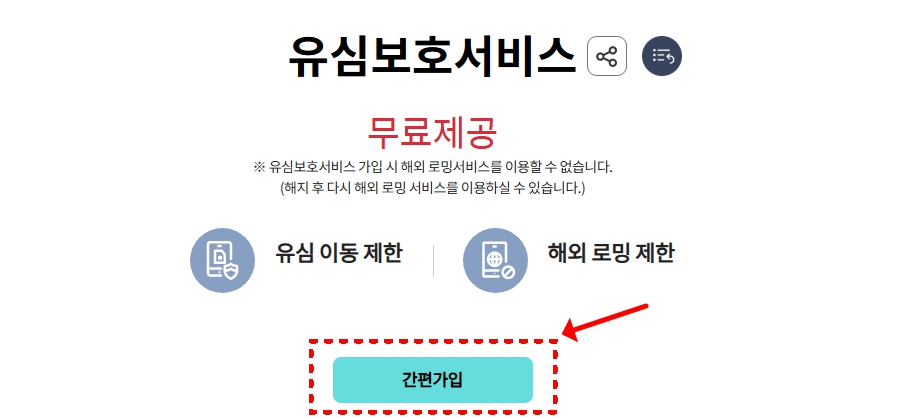인증 완료 후, '유심보호서비스' 항목을 선택하여 가입 요청을 합니다. 이때 다음 옵션 중 선택할 수 있습니다: