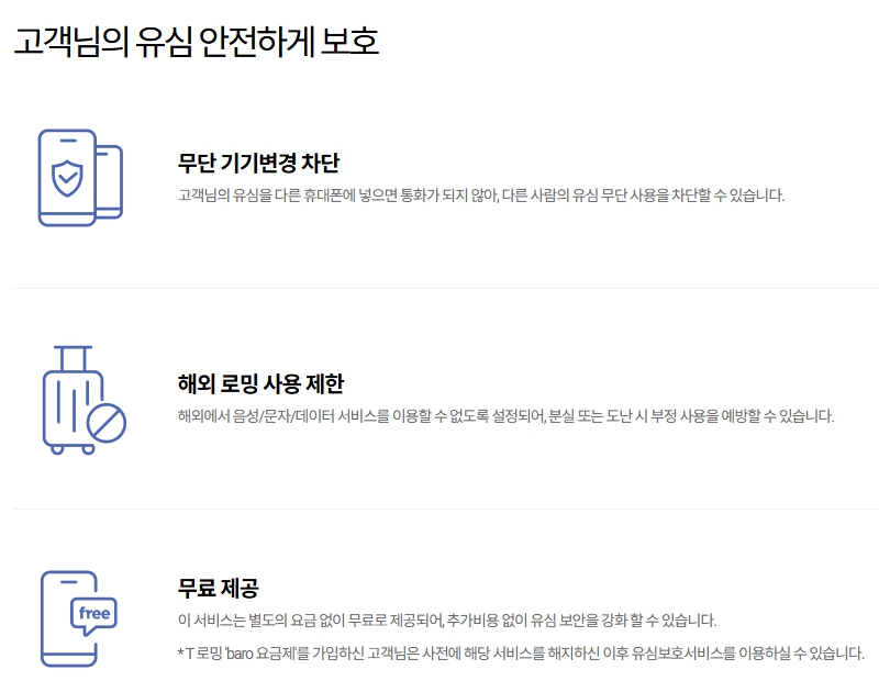- 해외 로밍 사용 제한: 해외에서의 음성/문자/데이터 서비스 이용이 차단되어 분실 또는 도난 시 부정 사용을 예방할 수 있습니다.